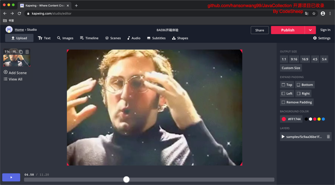 kapwing是一款在线轻量级的视频编辑studio,除了支持日常的视频编辑之外,还有很多工具集供使用,上手很容易