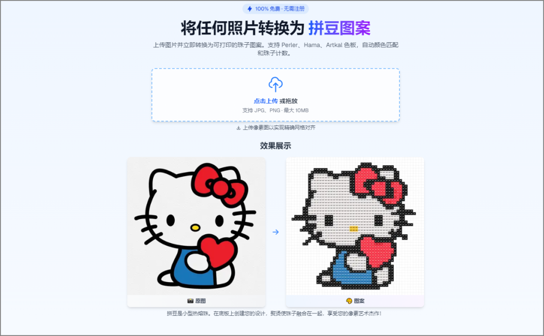 )网址:https://pixelbeads.pics/一个图片小工具,可以将上传的照片转换为拼豆(小型热熔珠有点像像素艺术图),支持 Perler、Hama、Artkal 色板,自动颜色匹配和珠子计数。可以手动调节颜色,可以调节网格大小,无需登录,免费使用。