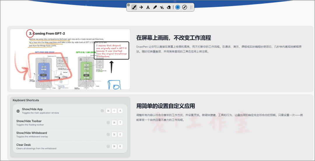 一款开源的工具,可以让你直接在屏幕上绘画和高亮,而不打断你的工作流程。在通话、演示、课程或实时编程时使用它,几秒钟内直观地解释想法。随时切换覆盖层,并用简单直观的工具在应用上做注释。