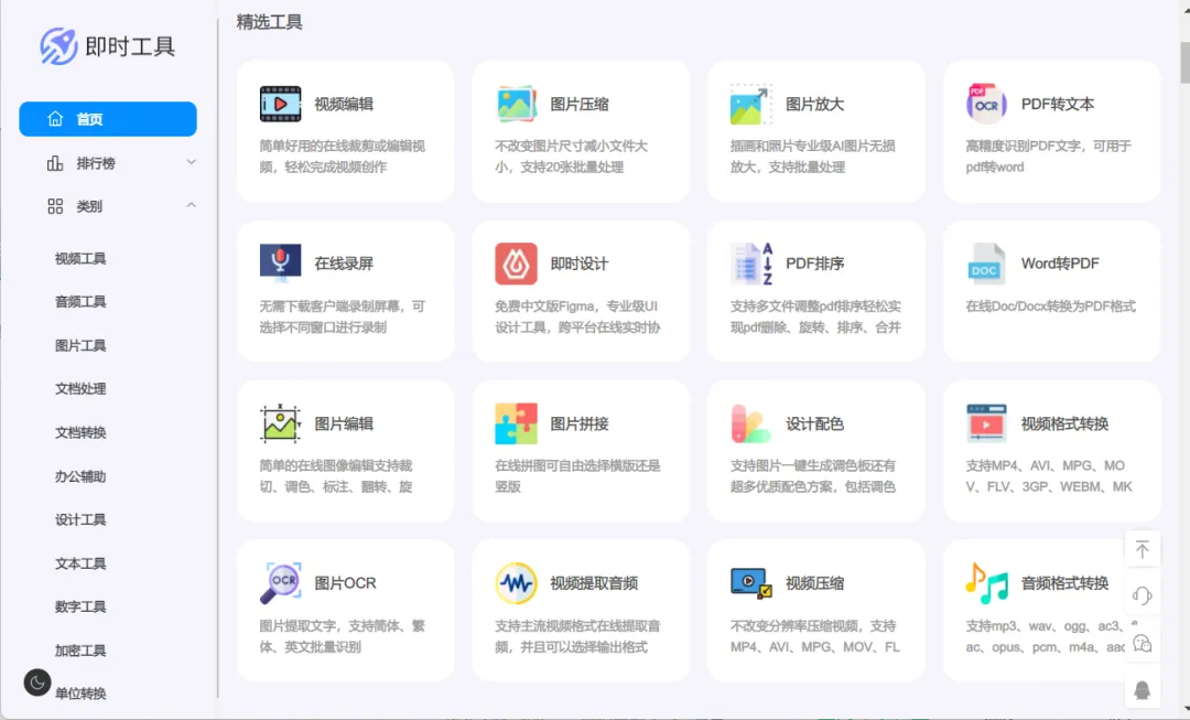 网站包括视频工具,音频工具,图片转换,文档处理等在内的11个大类。各种功能。