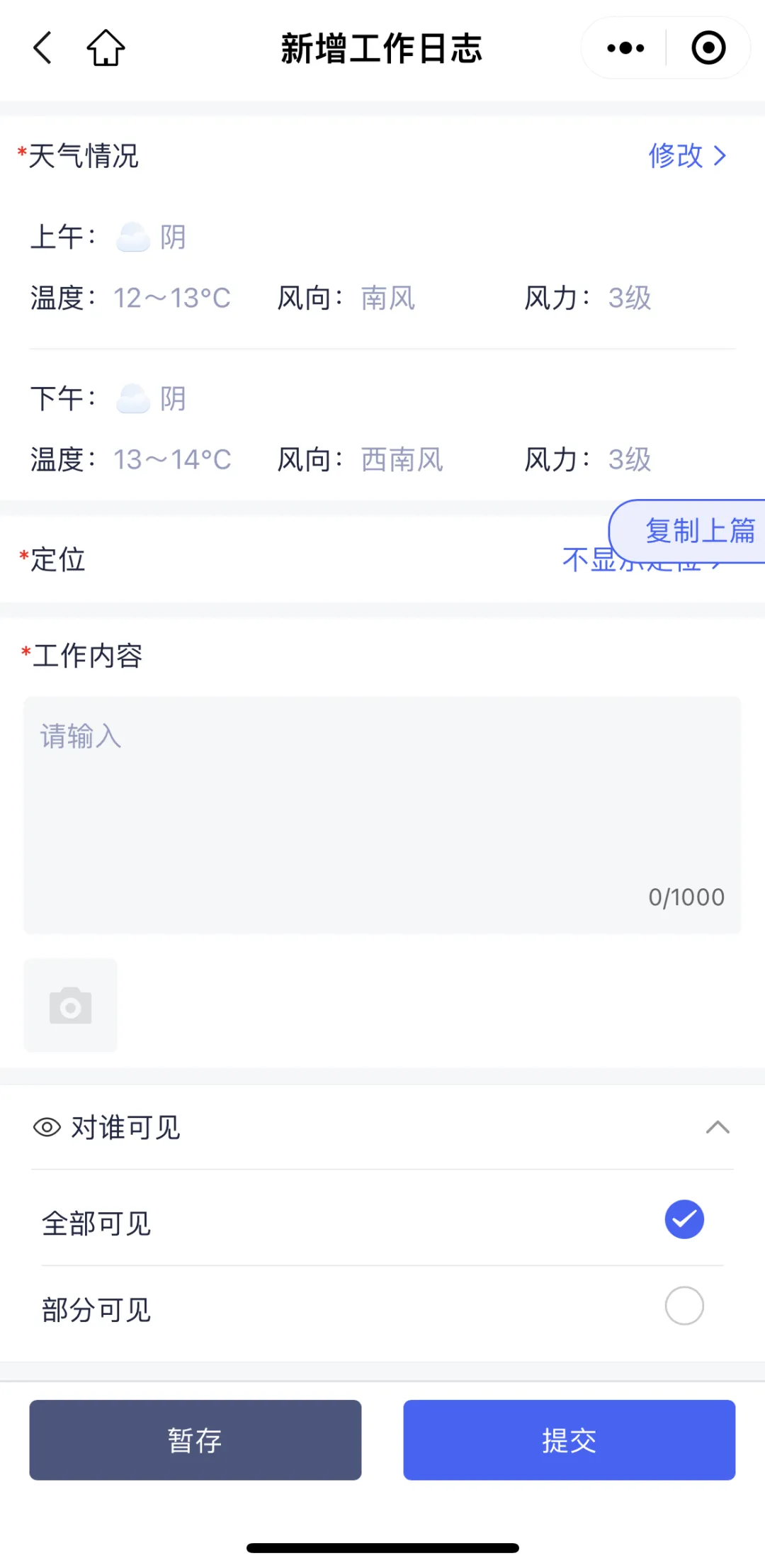 轻点“填报工作日志”,员工就能进入填报界面,不仅能输入文字内容,还能上传相关图片、视频资料,随时随地记录工作进度。除了向上汇报之外,员工还可以设置日志“对谁可见”,针对性实现工作信息的协同、同步。