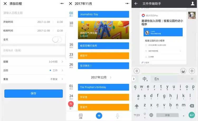 作为小程序内测首批 200 个团队之一,朝夕日历团队找准小程序坐拥微信社交关系链的优势,通过小程序制定日程安排,并以极低的操作成本分享给相关好友,然后在微信内部生成共同的事件提醒,把日历和日程安排做成了最符合中国人习惯的样子。