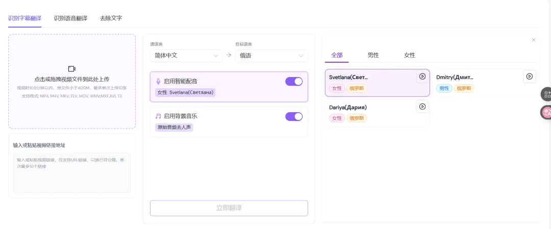 所以这里,在翻译之前的话我们可以先勾选去人声,之后用ai配音,翻译字幕就行。