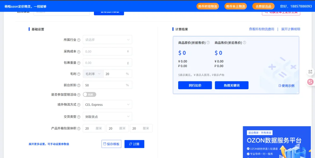 关于商品定价工具这里,我用的是这个萌啦定价工具,工具的话就是你把该填的信息都填好,然后点计算就可以自动出来相应的定价。