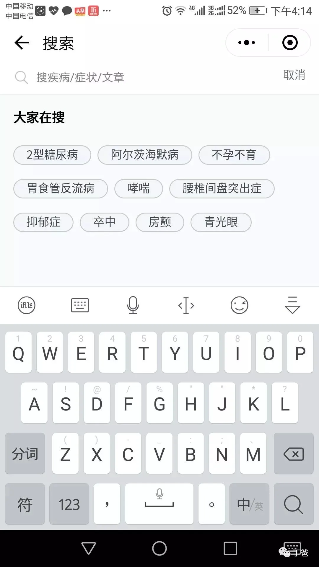 2、进入“企鹅医典”小程序后,可见一个搜索框,在框中输入想要搜索的关键词,即可搜索与之相关的疾病和健康知识。