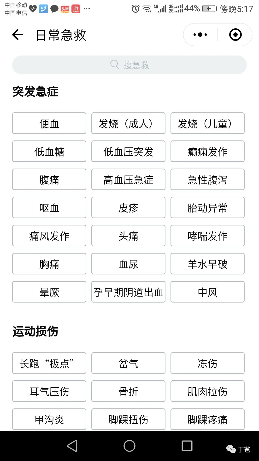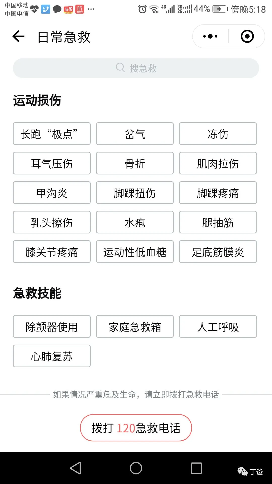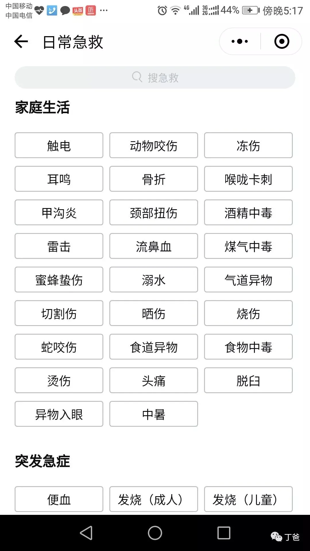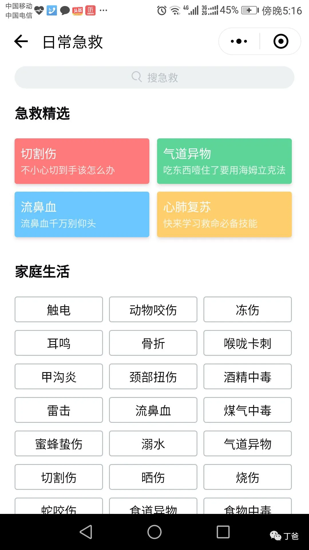 6、在“日常急救”栏目里有许多家庭生活、突发急症、运动损伤等情况下的各种急救知识。