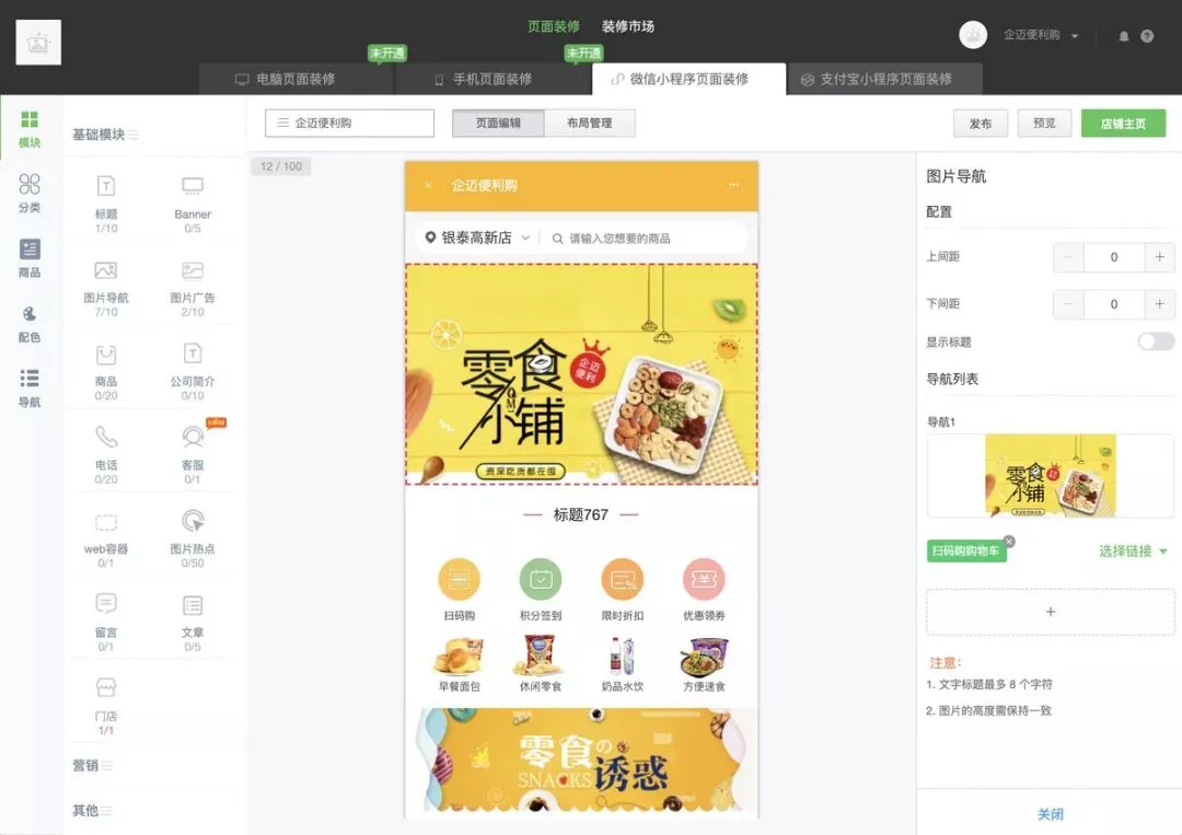 针对中大型门店客户,企迈云商提供SaaS平台,支持客户通过“拖拉拽”等方式,搭建独有的小程序店铺和功能。企迈云商按门店数量收取年服务费。