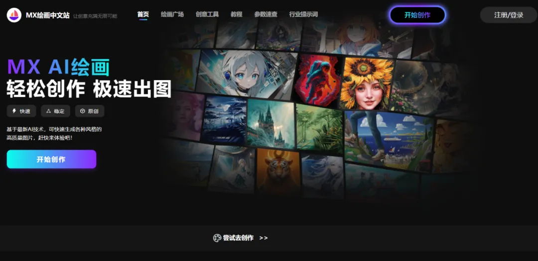 专业AI绘画,"轻松创作"、"极速出图",兼容各大绘画模型。