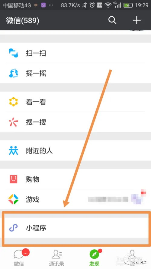 2.然后在【发现】界面,找到【小程序】并点击,如图所示: