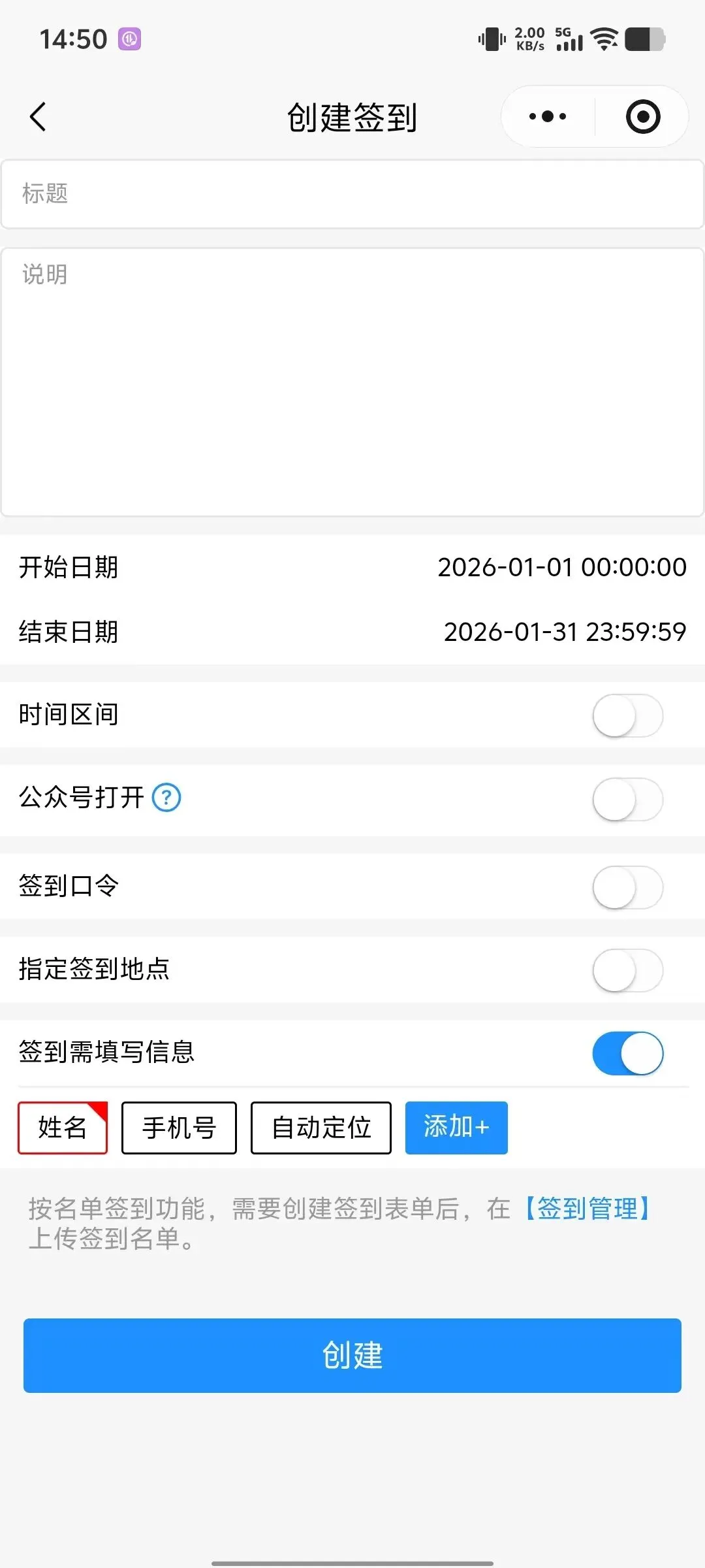 小程序有以下签到功能,可以设置签到周期,在这个周期内可以设置每天固定打卡时间段,小程序还可设置签到填写信息,例如:上传截图、填写姓名等,可以开启指定位置签到,可以管理外勤人员,防止员工作弊。