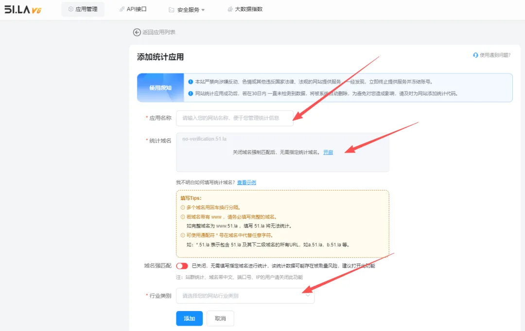 第一步:注册一个51la账号,输入应用的名称,填写自己的网站域名,注意需要写WWW.XXXX.COM这样的形式,最后选择一个行业。