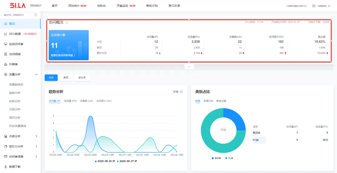 首先我们需要找一个免费的流量统计工具,而免费又专业的流量统计工具,在这里推荐大家用【51la】,它们提供每个月1000万PV的免费流量额度,这个对于大部分的企业网站来说都是足够使用的。