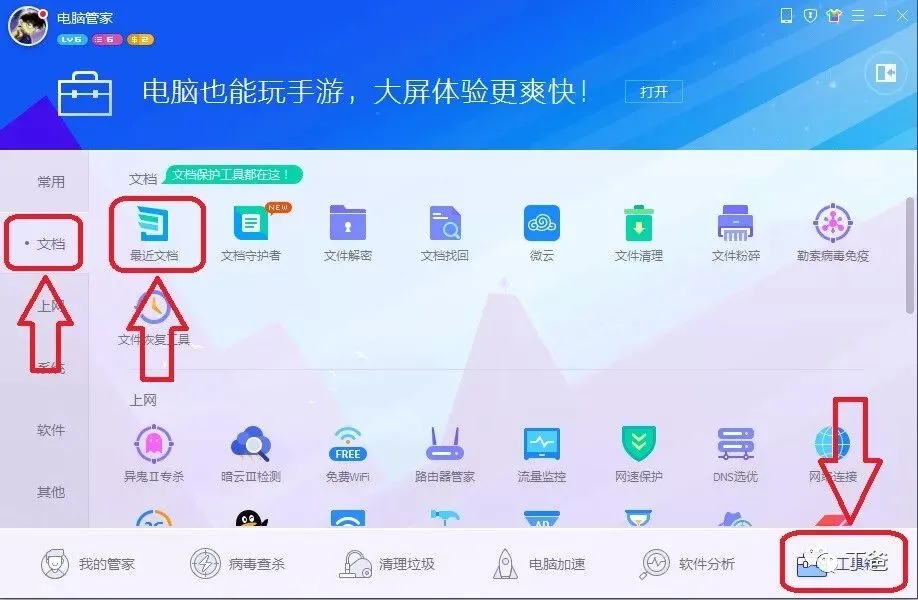 2、打开腾讯电脑管家,进入右下角的工具箱,选择左侧的文档菜单栏,点击启用“最近文档”插件。