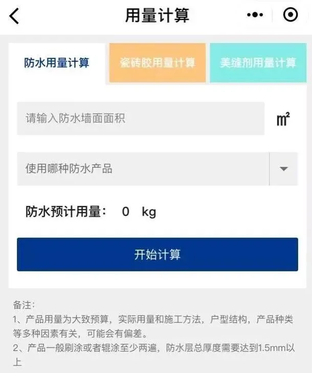 一般而言,防水产品要涂刷至少两遍才能保证防水效果。在防水用量计算页面,共有6款防水涂料产品可供选择,输入防水墙面面积,即可计算出防水涂料预计总用量,包含第二次涂刷的用量哦~