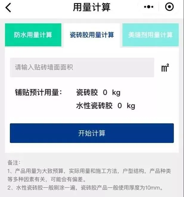 输入贴砖墙面面积,轻松知晓瓷砖胶和水性瓷砖胶铺贴用量。