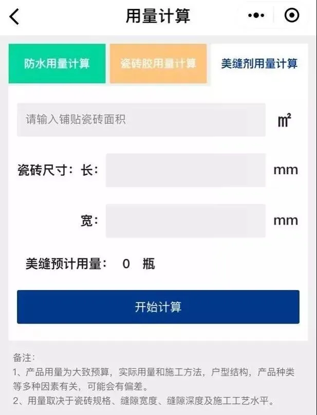 在输入铺贴瓷砖面积的同时,填入瓷砖的具体尺寸,直接奉上美缝剂购买量建议。