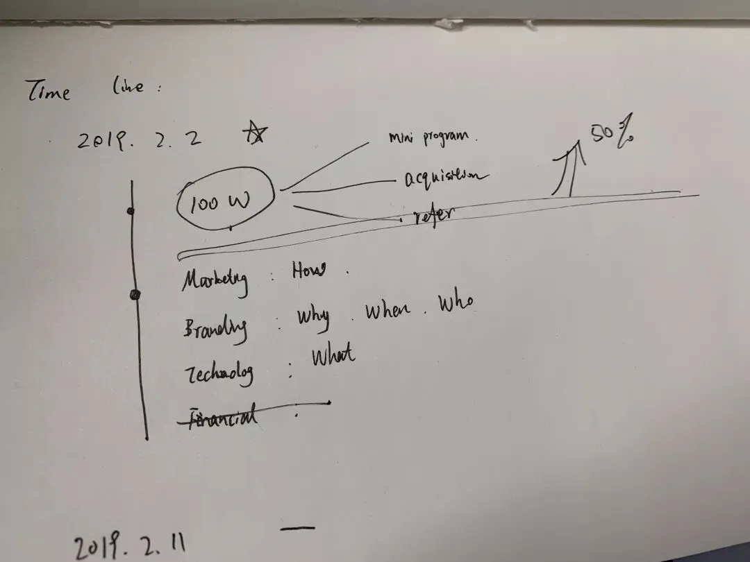 当确定好时间节点,活动的策划成为了侧重点。因为2019年的农历是己亥年,而且我们也是在春节期间完成增长任务。所以这次增长被定名为“己亥计划”。我们先进行了一个梳理,当时的手稿和板书大概有几十张,比较乱,我的字也比较丑大概长这样: