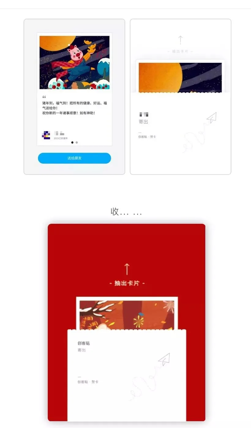4.用户b点击领取贺卡,此时用户会获得一个完整的卡片领取仪式感体验——抽出卡片,并有卡片翻转的体验;