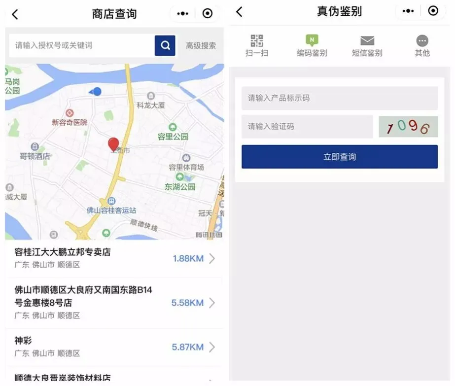 小程序页面色彩丰富大方,由真伪鉴别、商店查询、漆量计算、立邦认证四大板块组成。在真伪鉴别板块中,小程序提供三大鉴别方式:扫一扫、编码鉴别以及短信鉴别,还提供了“六看”鉴别方法。