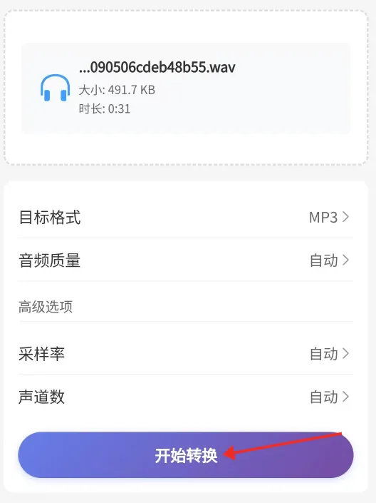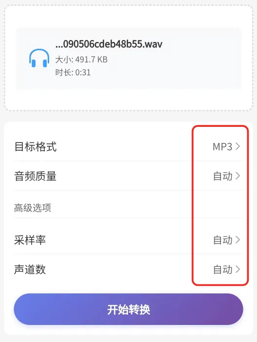 3. 调整配置参数:默认目标格式是mp3,如果没有特殊要求可以不需要改动(需要的话可以自行调整:目标格式、音频质量、采样率、声道数等)