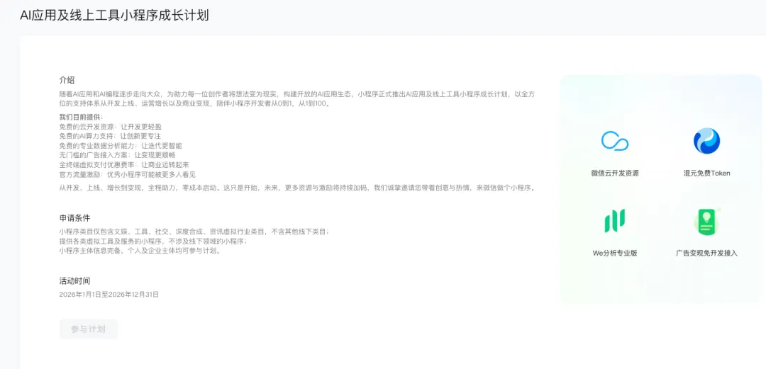 随着AI应用和AI编程逐步走向大众,为助力每一位创作者将想法变为现实,构建开放的AI应用生态,小程序正式推出AI应用及线上工具小程序成长计划,以全方位的支持体系从开发上线、运营增长以及商业变现,陪伴小程序开发者从0到1,从1到100。目前提供:免费的云开发资源:让开发更轻盈免费的AI算力支持:让创新更专注免费的专业数据分析能力:让迭代更智能无门槛的广告接入方案:让变现更顺畅全终端虚拟支付优惠费率:让商业运转起来官方流量激励:优秀小程序可能被更多人看见从开发、上线、增长到变现,全程助力,零成本启动。这只是开始,未来,更多资源与激励将持续加码,我们诚挚邀请您带着创意与热情,来微信做个小程序。申请条件