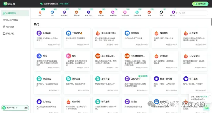 包含了「AI模板写作」「AI对话」「专家对话」三种模式和 200+ 写作场景,像是热门的改写、续写、小红书笔记生成、爆款标题、报告总结、带货文案等……统统都能搞定。