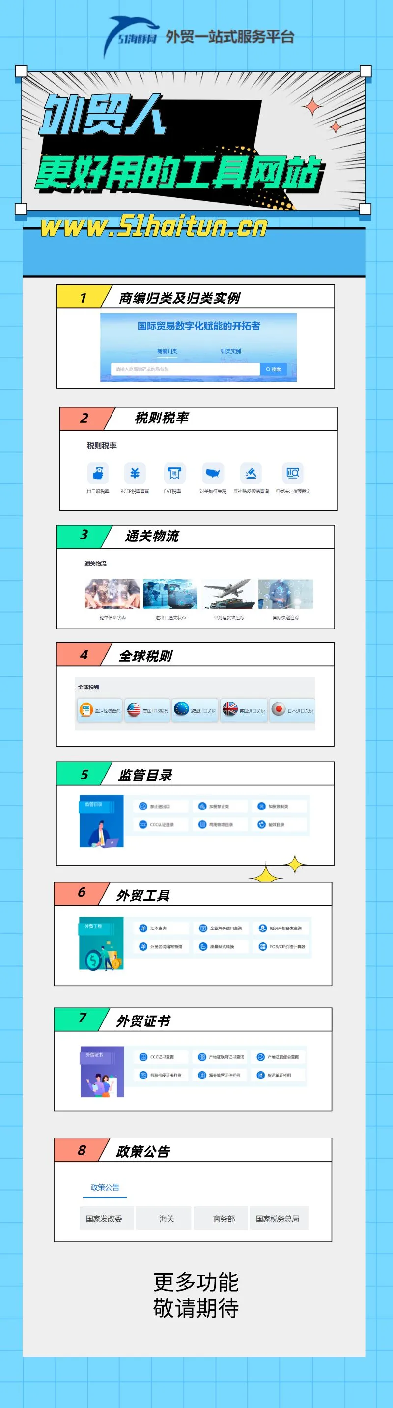 汇聚税则税率、商品归类、智能归类、通关物流、全球税则、监管目录、外贸证书、政策法规等外贸服务工具。