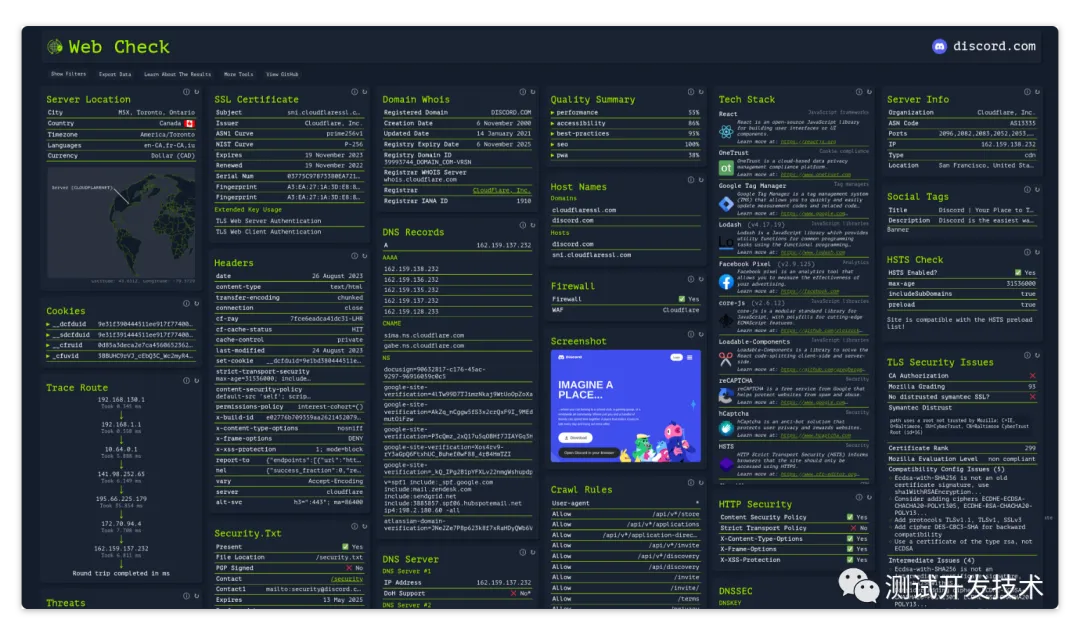 它只需要输入一个网站就可以查看一个网站几乎所有信息,如 IP 信息、SSL、DNS记录、Cookies、域名信息、搜索爬行规则、服务器位置、重定向记录、开放端口、路由跟踪、DNS安全扩展、网站性能、关联主机名等。