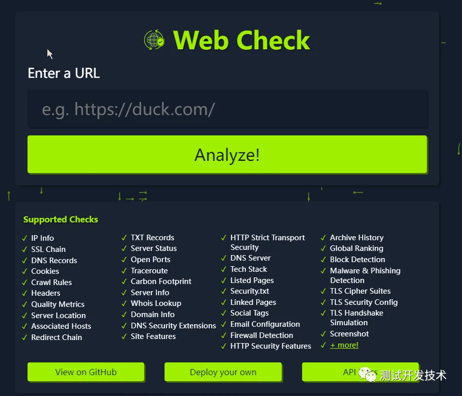 或者直接通过Docker容器化部署:docker run -p 3000:3000 lissy93/web-check
