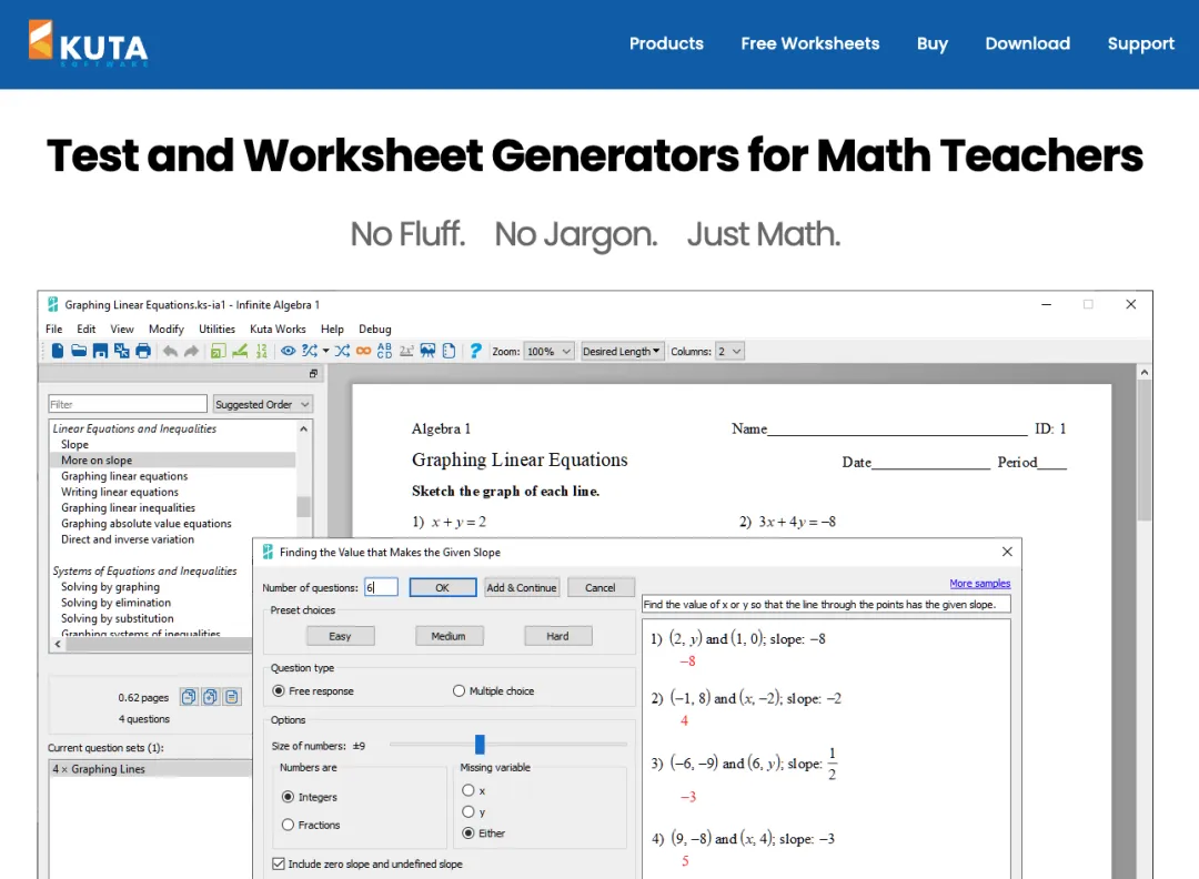 特色:Kuta 的题库涵盖了从低年级 Pre-Algebra (初级代数)到高年级 Calculus (微积分), 从 Geometry (几何)到 Algebra (代数)小学中学的大部分数学知识配套练习。免费版针对每个内容的每个知识点都有对应的 10 - 20 道不等的练习,以及详细解答。付费版可以根据每个类型,随机生成不同程度的题目。