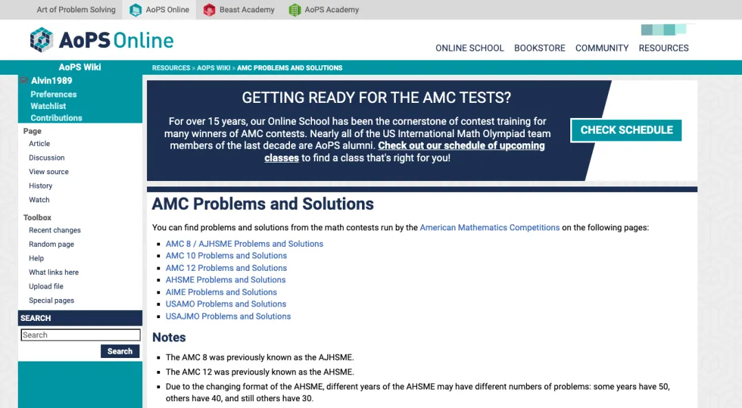 特色:在网站上看数学题的好处是解法非常多,有些题甚至有十种解法,一般教科书上篇幅有限,不好一一列举,但在网站上都有!非常推荐各位学 AMC 的同学上网址上多做做真题、看看别的的解法。