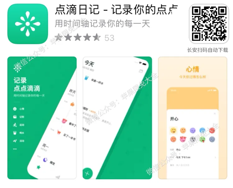 ● 简介: 「点滴日记」一款用时间轴记录你的每一天点点滴滴的软件。可以记录心情、收支、运动、喝水以及各种日常活动等,只需点击几次甚至无需输入。