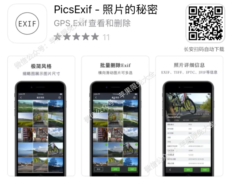 ● 简介:「PicsExif」一款极简的照片信息查看和编辑工具。支持删除GPS,Exif等信息。同时还可批量操作缩略图页面横向等功能