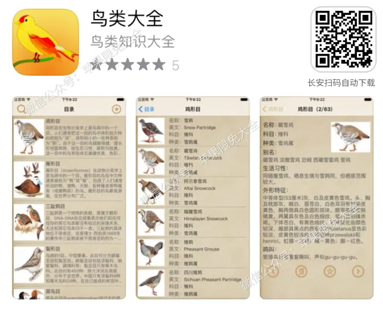 ● 简介:「鸟类大全」一个鸟类百科全书,详细收录一千三百多种鸟类,共分为17种目录;74科目,300多个种类。