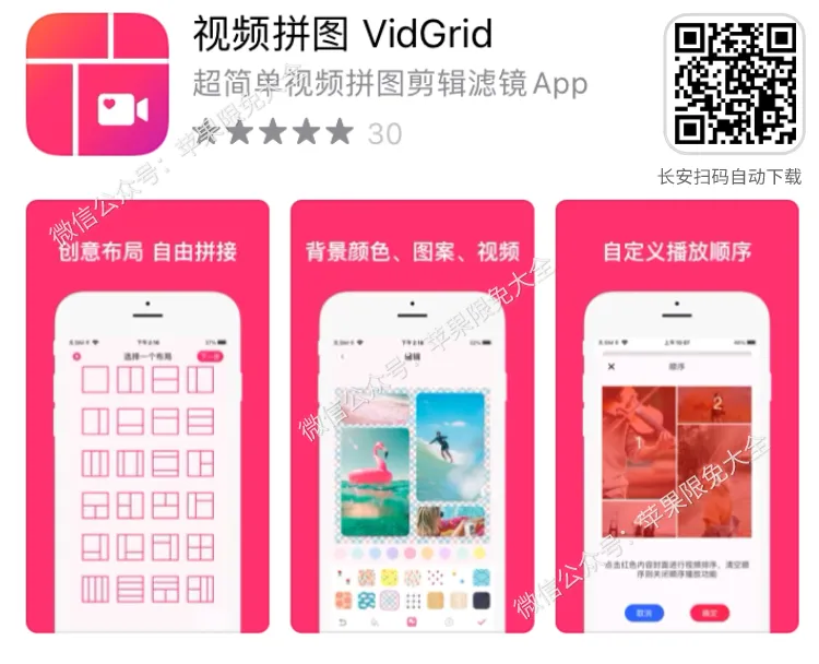● 简介:「视频拼图 VidGrid」一款超级简单易用的视频拼接应用。支持种视频拼接布局、自定义背景图案、以有快速剪辑、加速、上滤镜等