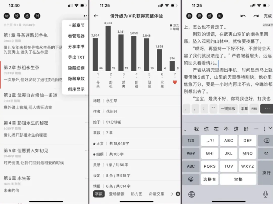 页面简洁无广非常有质感,功能强大,尤其是创作分析,每个人物的写作字数、关系、登场情况等等,让你的文章一目了然,还有一键排版简直太省事了。
