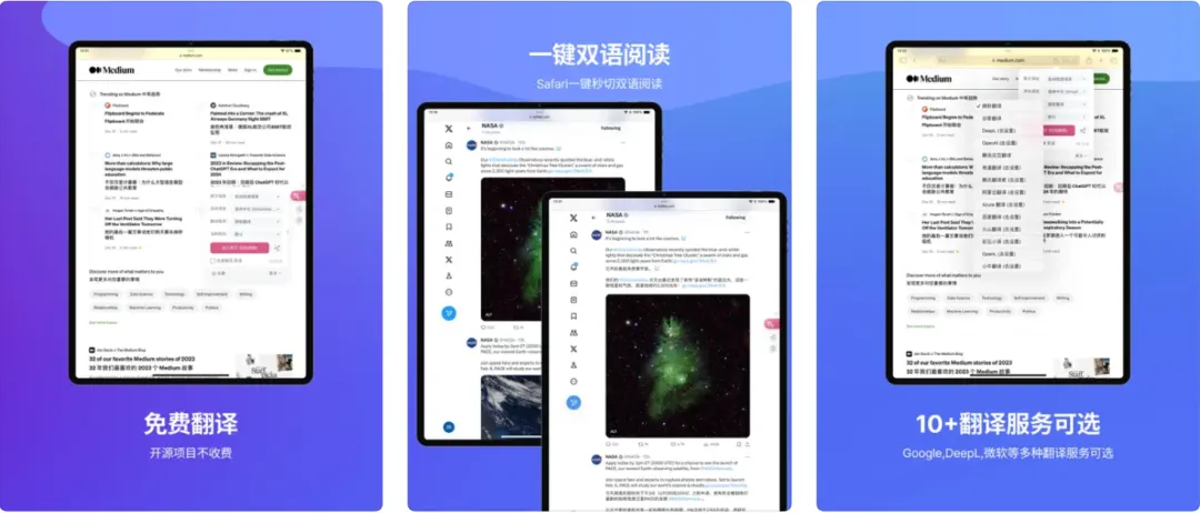 自定义译文的不同显示效果,另外支持多网页视频字幕实时对照翻译等,还可以对照翻译PDF、EPUB电子书等!