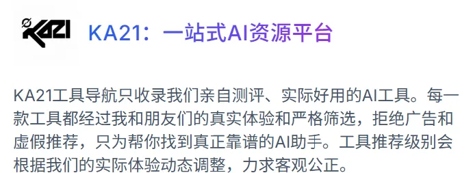 它的联网备案时间是2025年5月,打开KA21,首页中看到一句话:"只收录我们亲自测评、实际好用的AI工具"。