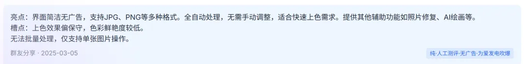 说不好的地方——上色效果有点保守, 不能批量处理。