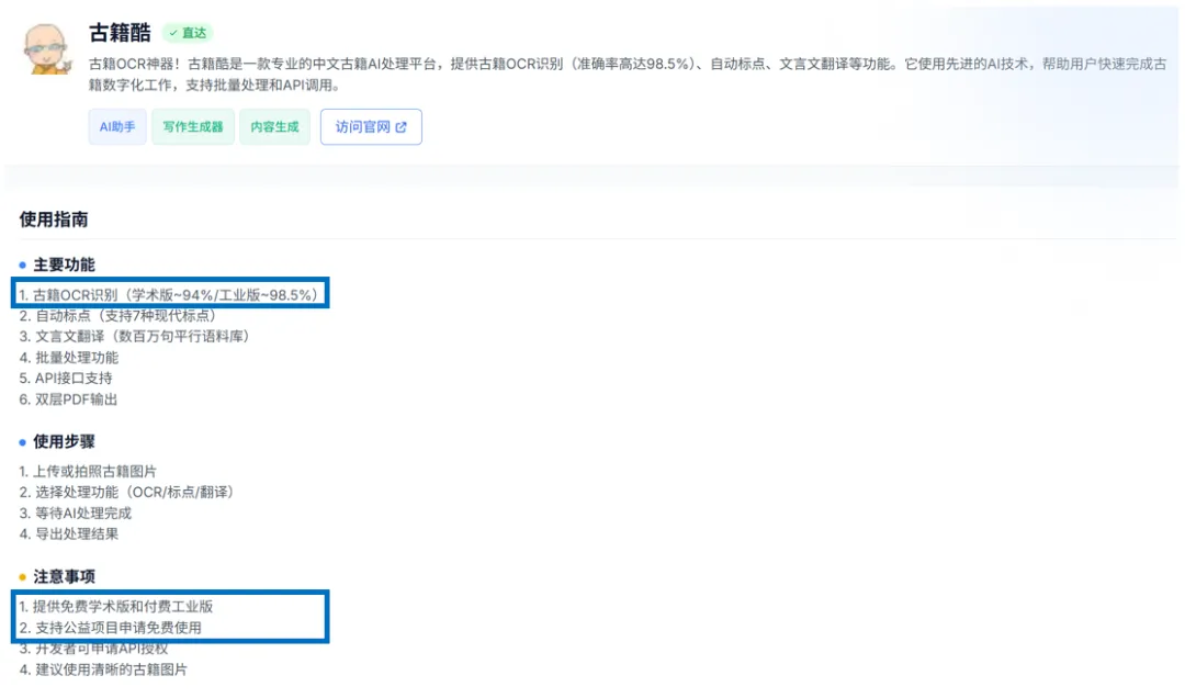 举个例子, "古籍酷"这个工具, 直接告诉你OCR识别准确率学术版94%、工业版98.5%, 还有免费学术版, 支持公益项目免费用。