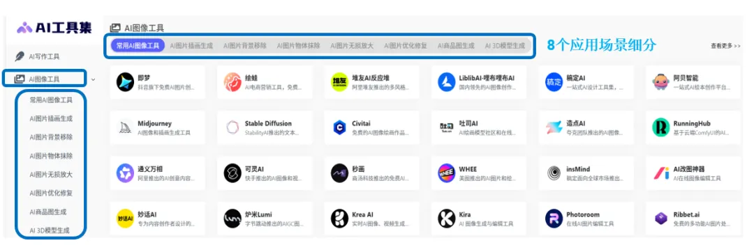 直接显示了比如AI图像工具, 直接给你分成了图片插画生成、背景移除、物体抹除、无损放大、优化修复、商品图生成、3D模型生成... 整整8个子类!