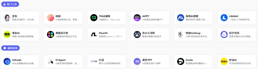 首页还分了"热门工具"和"最新收录"两个板块, 想找技术上已经成熟的还是想尝鲜, 都能满足。