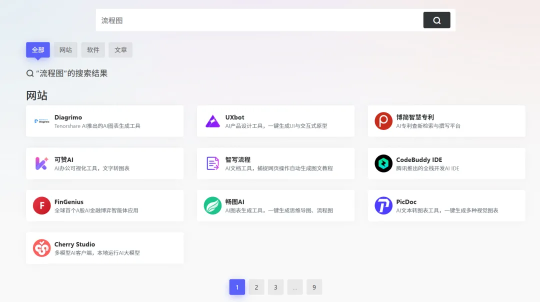 然后在AI工具集中, 同样的搜索, 显示结果有9页, 每页10个结果, 这么多内容, 得花20-30分钟慢慢挑。
