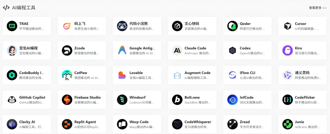 它的 "AI编程工具"分类下有至少有30个: TRAE、码上飞、代码小浣熊、Cursor... 市面上主流的基本都有, 得好好对比一番。