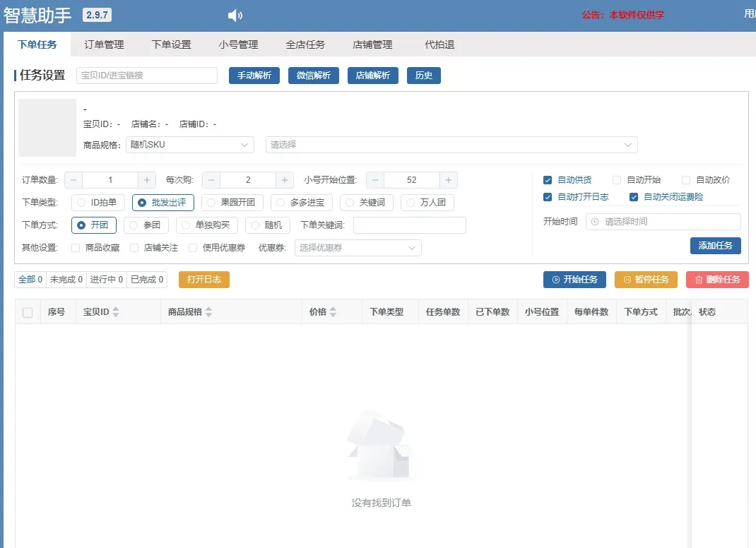 1、pdd后台打开商品列表,找到需要做评价的链接,复制商品ID,放到软件输入框里,点击解析(如上图)2、商品规格可以随机,也可以指定,多种规格可选择;3、订单数量(链接需要做多少评价就填多少数字); 每次购买(pdd默认批发2件起,填写2件就可以不用动); 小号开始位置(对应小号列表当中的序号)4、下单类型(出评需要选择多多批发,其他渠道出评率低不建议使用); 下单方式(默认开团就可以,其他不用选)5、右侧自动添加供货,自动改低价选中(自动添加供货前提是添加店铺才可以,自动改低价是催付改价,可以改0.1或者1进行付款)三:下单 以上步骤设置完成以后,点击添加任务,然后再选中任务,再点击开始任务即可下单(如下图)四:付款 下单完成后,去订单管理点击待支付进行付款发货,(注意:发货后,72小时去收货上评)付款有2种方式(注意:zfb扣款顺序用余额,不要用银行卡)第一种:扫码付款,微信支付就是用微信扫码,扫码支付就是zfb扫码(建议用zfb)第二种:自动付款(订单多就需要用自动支付方便快捷,需要下单设置配置一下密码,如下图)注意事项:订单设置里填写6位数支付密码,需要回到订单里去选择订单付款,先选择一个输入手机号验证自动支付,然后软件会自动跳转自动支付完剩下的订单。看完觉得有用帮忙点个赞!有疑问评论区可留言,拼多多店铺出平、提升销量,增加店铺关注,商品收藏有需要可以联系小编V:kzq971126👇👇👇👇👇
