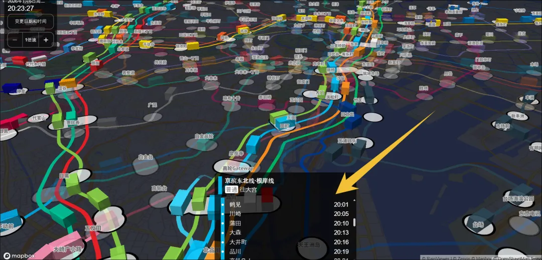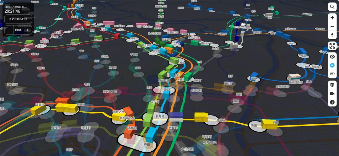这是一个实时的东京交通3D地图,可以直接在网页上看到火车、地铁飞机,全都在按照真实的时间在跑 。