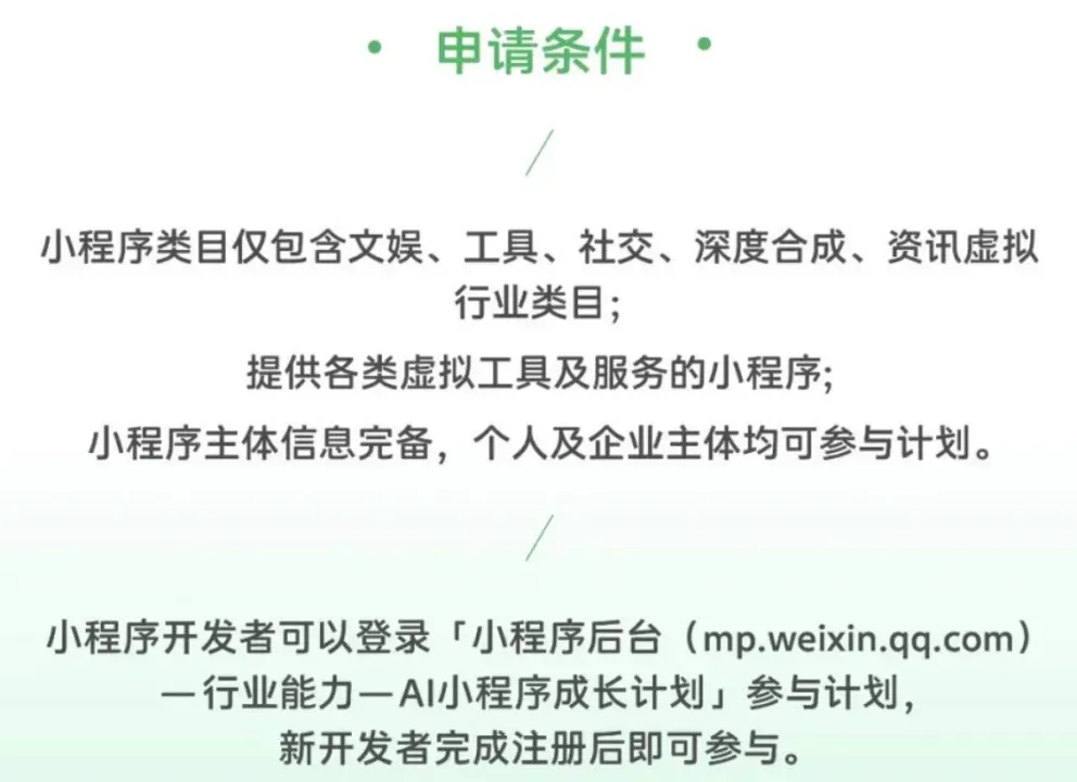 最后,所有线上类应用均可参与该计划,包括线上工具、AI原生及娱乐类小程序。开发者可登录「小程序后台(mp.weixin.qq.com)—行业能力—AI小程序成长计划」参与,新开发者完成注册后即可参与。