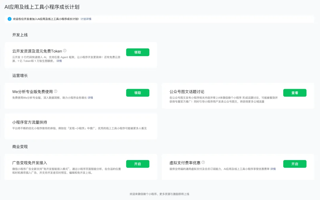 微信小程序正式推出「AI应用及线上工具小程序成长计划」。提供云开发资源、AI算力、数据分析、商业变现及流量激励等全方位支持,陪伴开发者完成从“0到1”再从“1到100”。