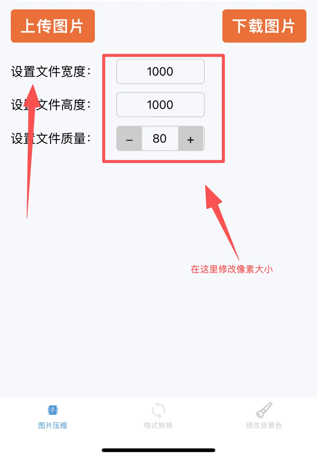 2、上传需要修改的图片,修改宽度、高度即可调整像素大小(图片的像素大小就是指图片的宽度和高度)