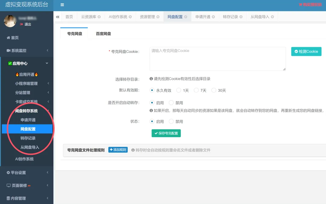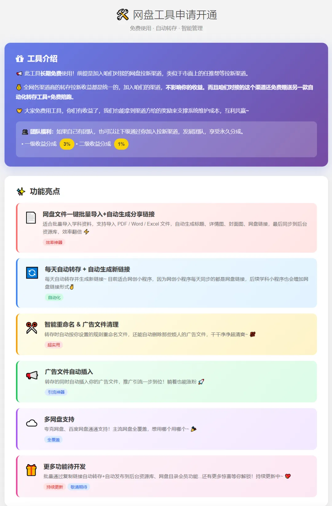 这个网盘转存功能,最近花了些时间来开发,主要的功能已经实现了,后续还会增加更多的功能,大家有什么建议也可以跟我提~有一个功能我觉得是很方便的,就是对于做教务学科资料网盘拉新的,可以通过这个功能,把网盘里的文件一键导入到我们小程序后台里,也会自动生成标题、详情图、封面图、网盘链接,然后小程序里就可以直接下载资料的网盘链接了。